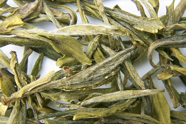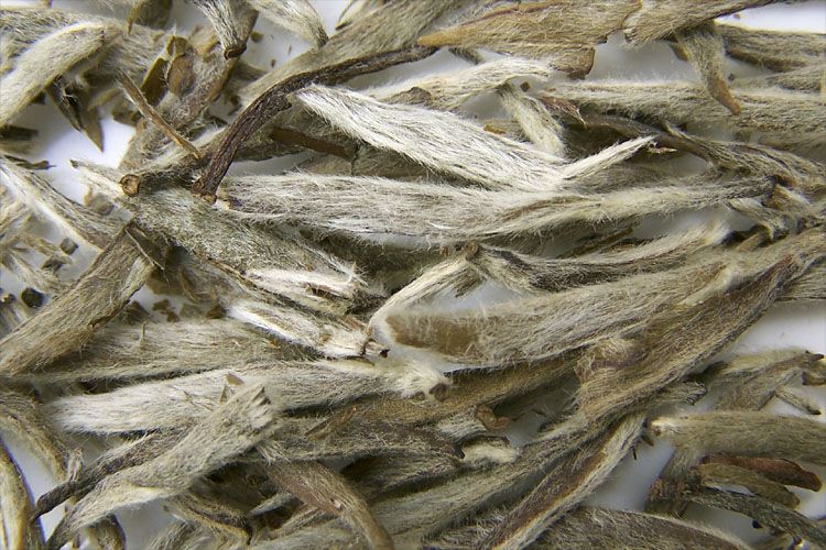 Bai Hao Yin Zhen (Weißbehaarte Silbernadeln). Der Name "Weißer Tee" rührt vom dicken weißen Flaum auf der Rückseite der Blattknospen her.