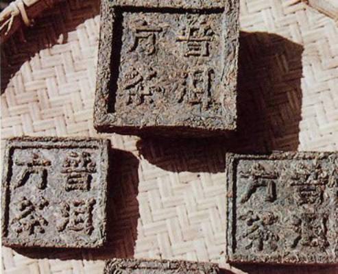 Auf den Teeziegeln sind die Schriftzeichen "Pu Er Fang Cha" (Pu Erh-Ziegeltee) gepresst.