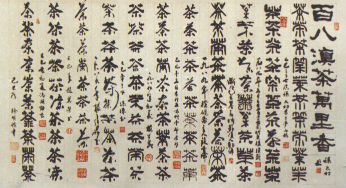 Eine Kalligraphie mit 108 verschiedenen Schreibweisen für Cha (Tee)